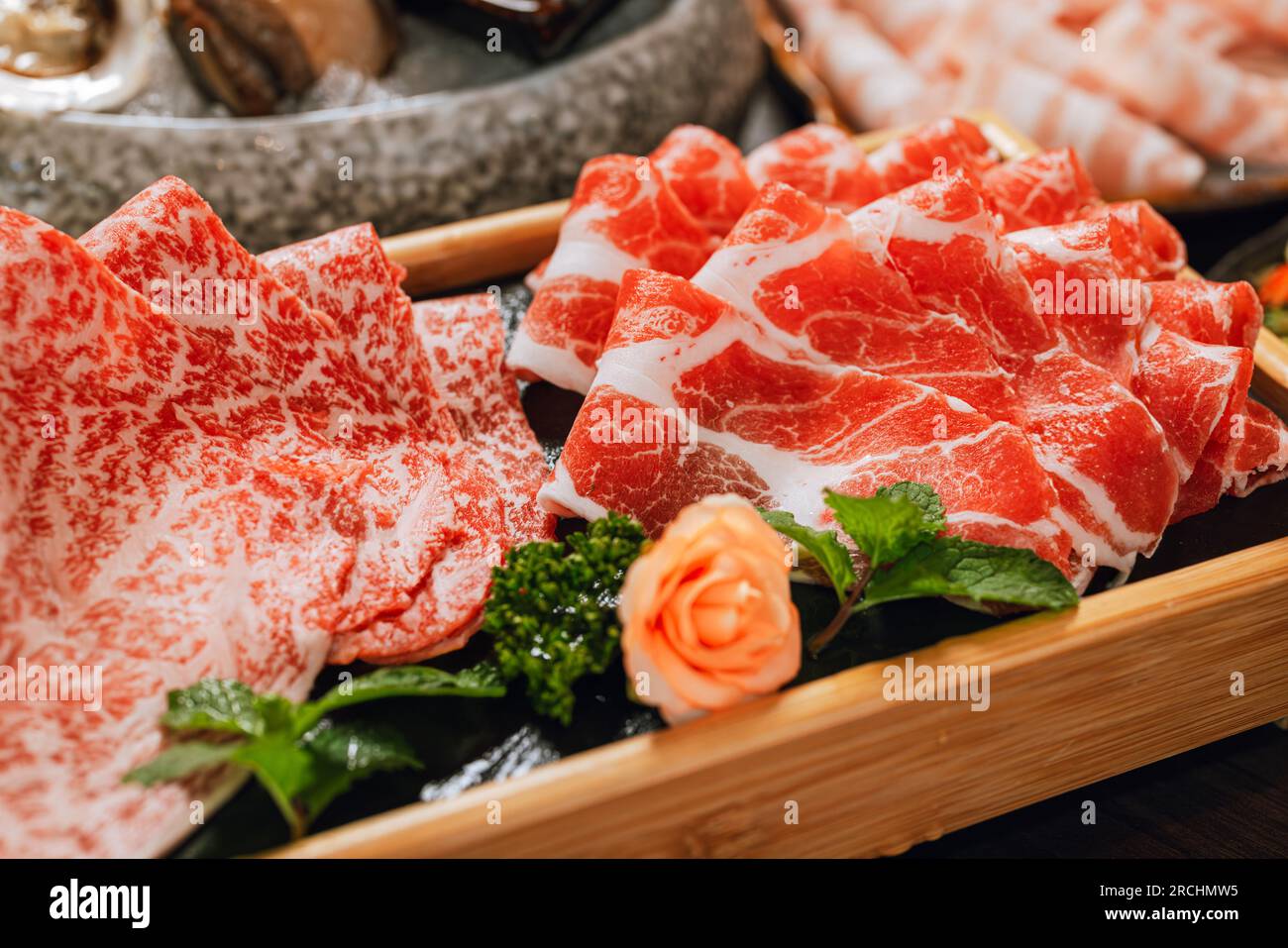 Tag : Premium Rare Slices Pork With High Marbled Texture On Circle Wooden Plate Served For Hot Pots
