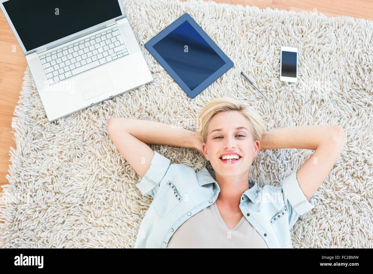 Tag : Pretty Blonde Woman Lying On The Floor And Smiling At The Camera Stock Photo Alamy