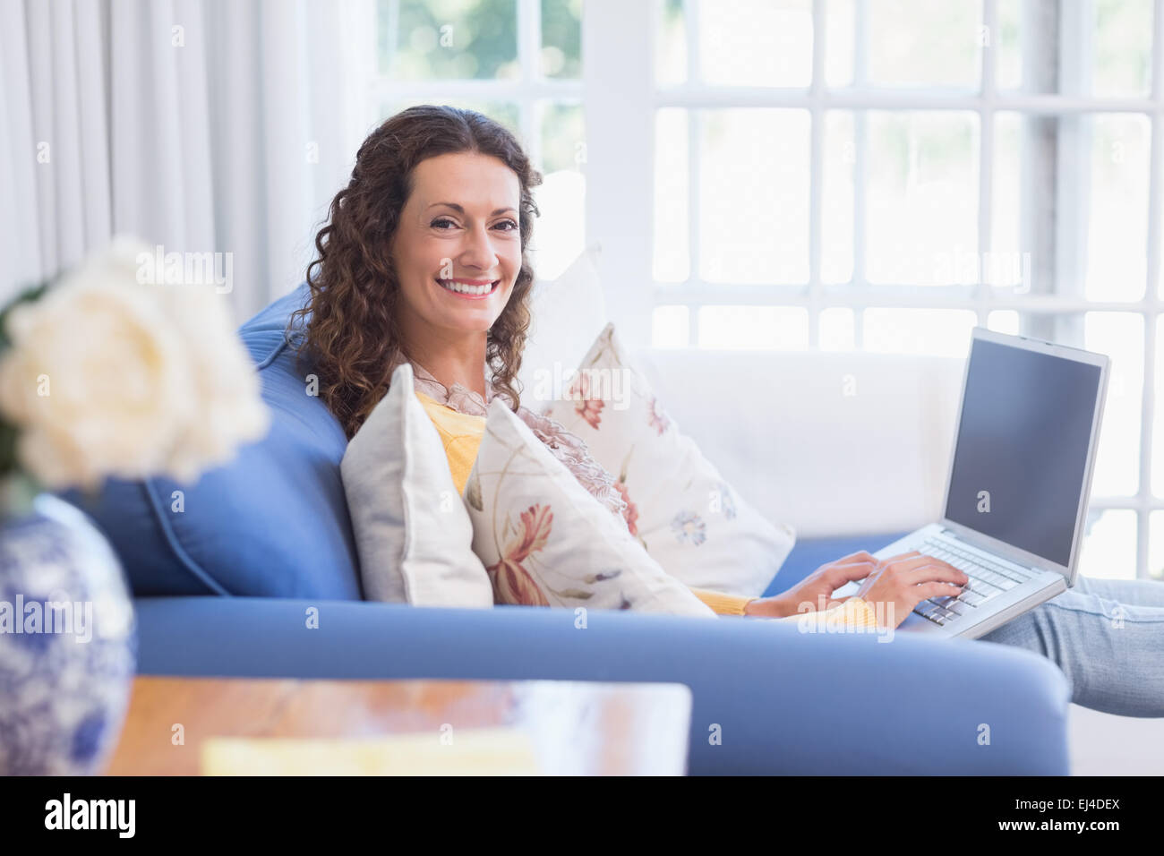 Tag : Pretty Brunette Relaxing On The Couch With Laptop Stock Photo Alamy