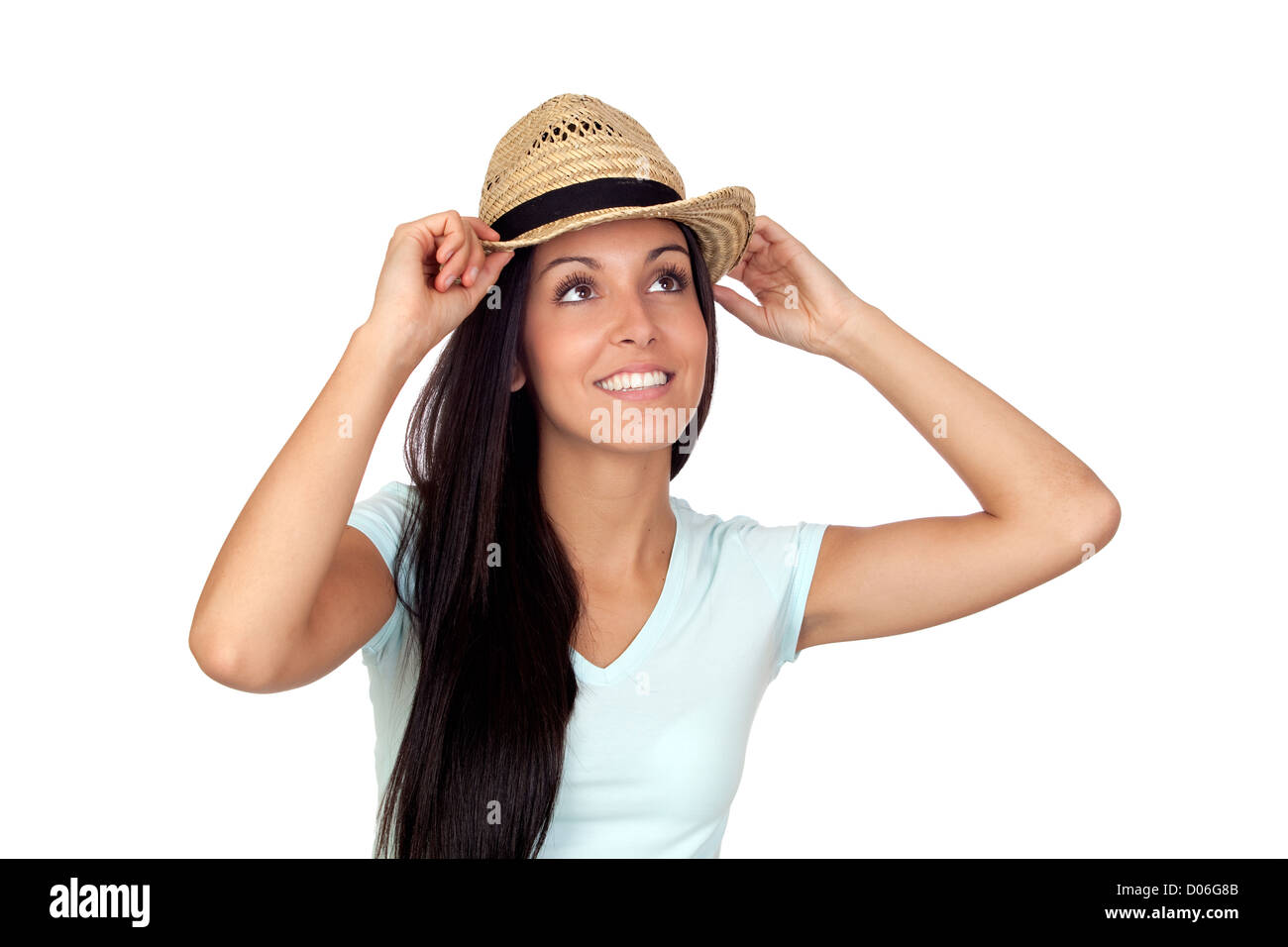 Tag : Pretty Brunette Woman With Straw Hat Isolated On White Background Stock Photo Alamy