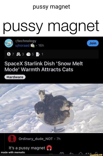 Pussy Magnet Pussy Magnet Ba Spacex Starlink Dish Snow Melt Mode Warmth Attracts Cats Hardware pictures has 500 x 400 · 50 kB · jpeg.
