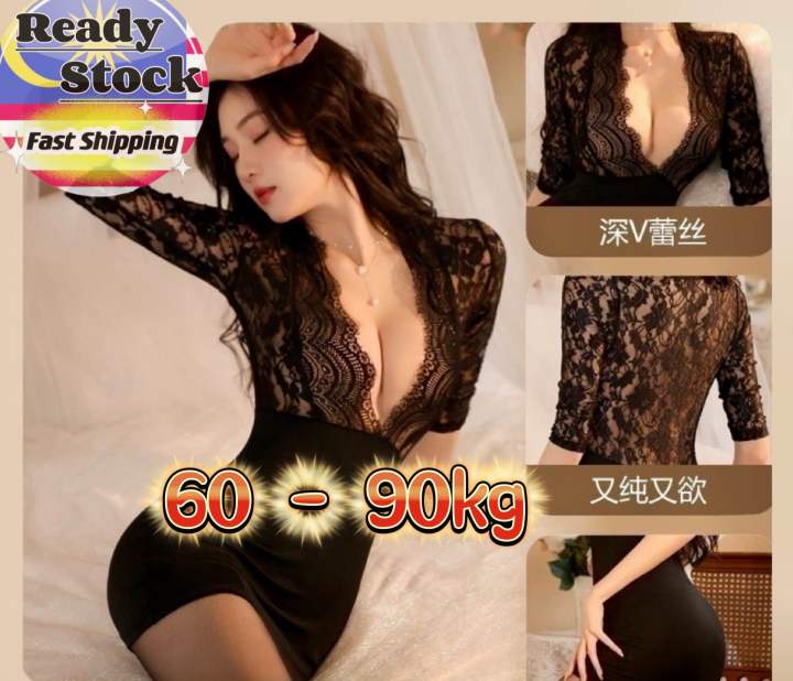 Tag : Readystock Pajamas Sexy Lace Deep V Nightdress Lingerie Sleepwear Big Size V
