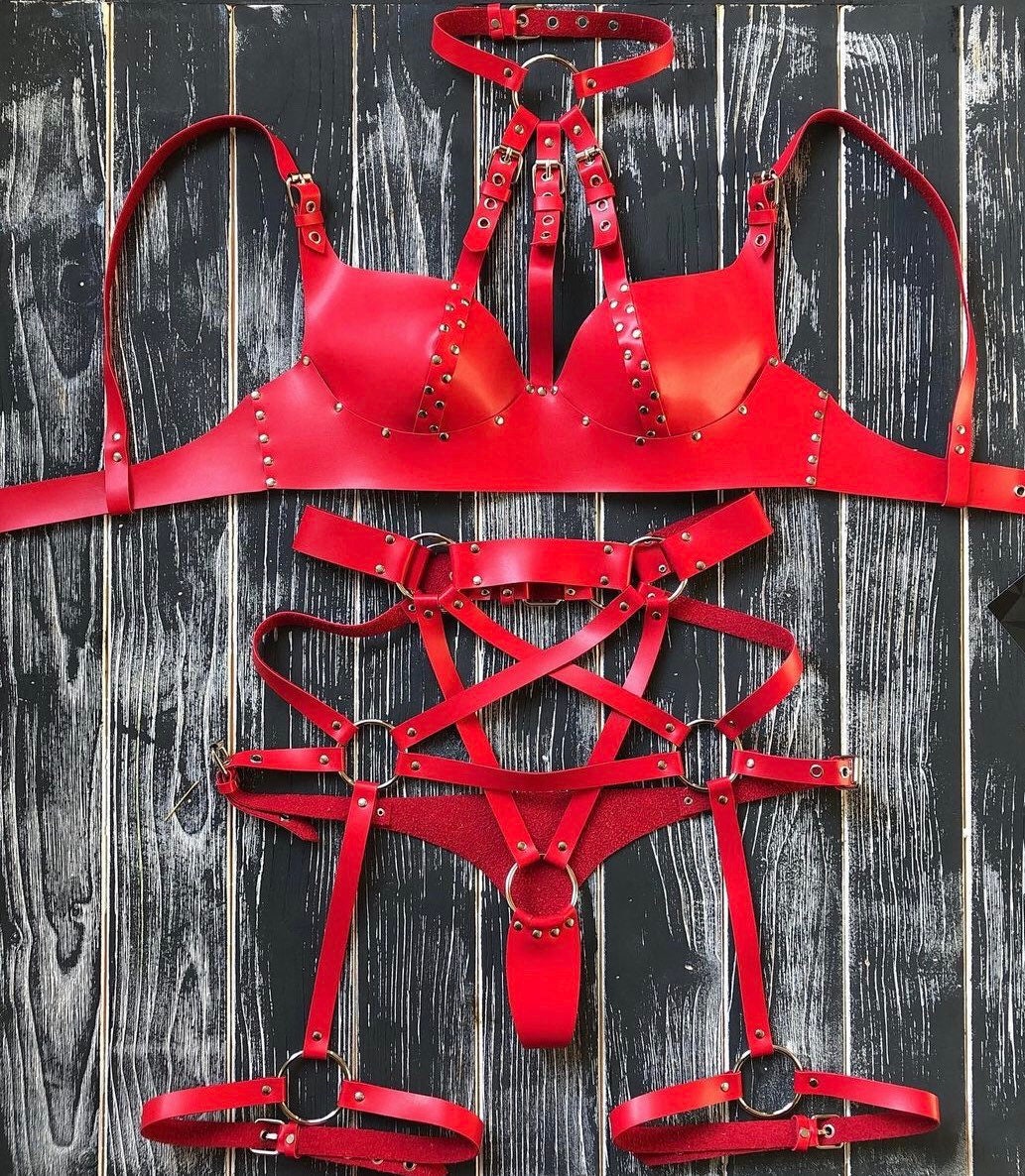 Red Real Leather Lingerie Set Bra Bralette Panty Panties Thong Etsy is a popular picture for sexy and hot.