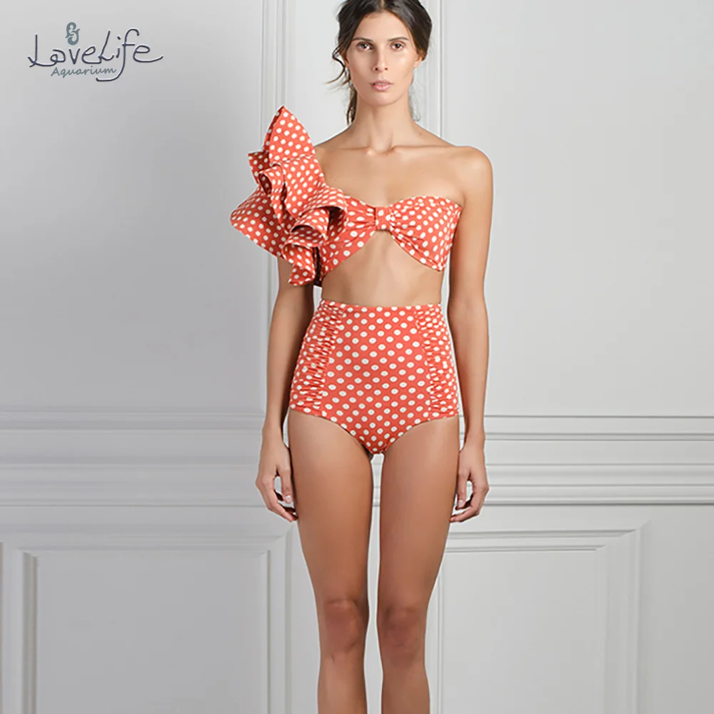 Tag : Ruffled Polka Dot Print Bikini Orange Tankini Women Swimming Suits Swimwear Patchwork High Waist