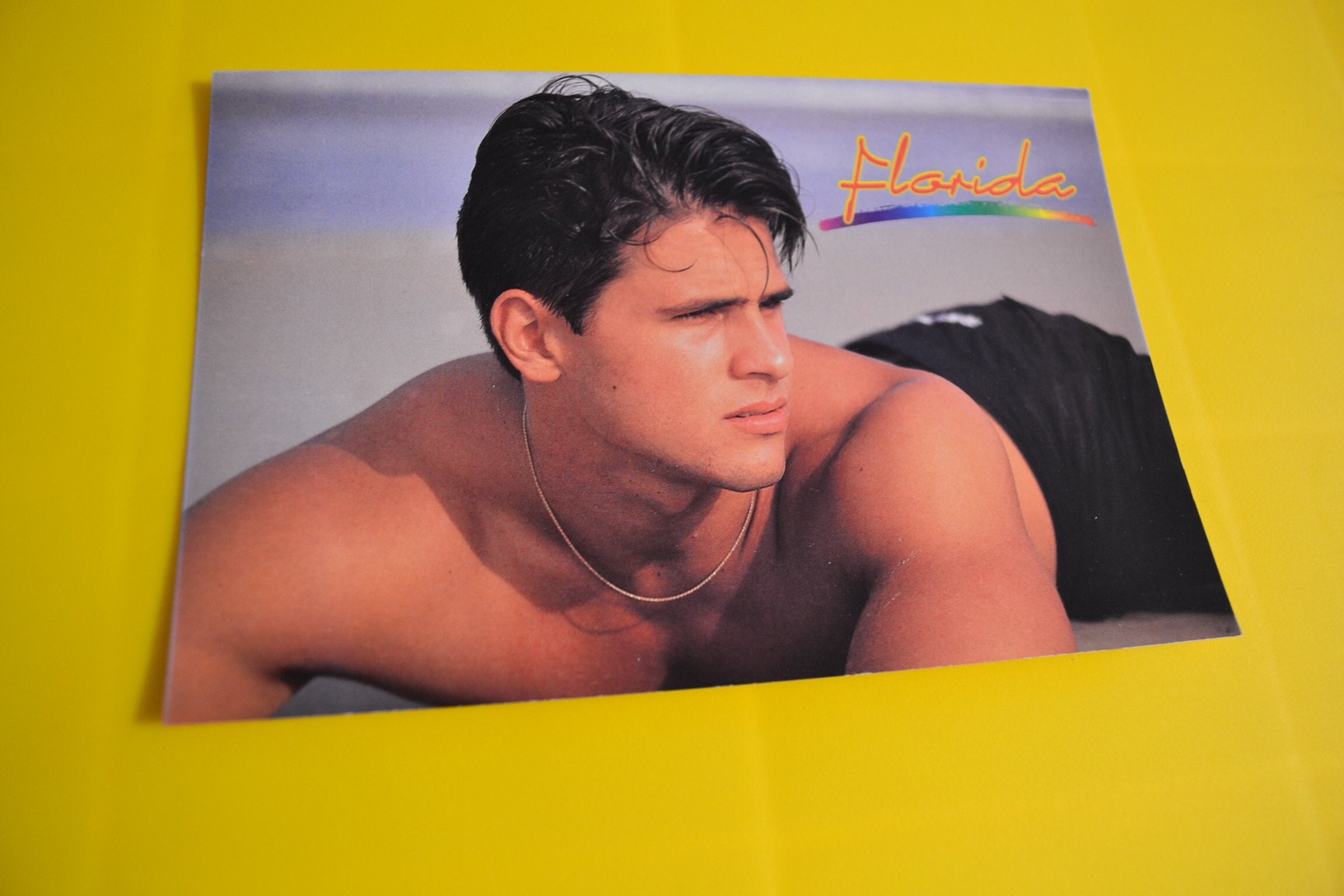 S Beefcake Postcard Brunet Man Black Board Shorts Gold Necklace Gay Interest Beach Scene is a popular picture for sexy and hot.