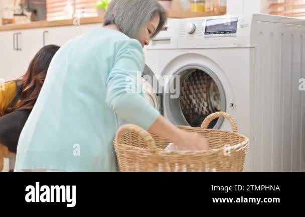Tag : Senior Mother Doing Laundry At Home Mature Woman Putting Clothes In Front Of Washing Machine