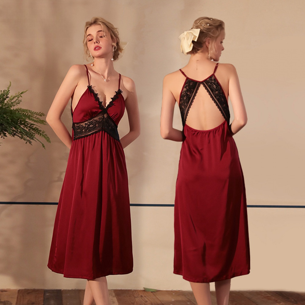 Tag : Sexy Ice Silk Satin Strap Sexy Lingerie Nightdress Long Lace Stitching Flirting Seductive Home