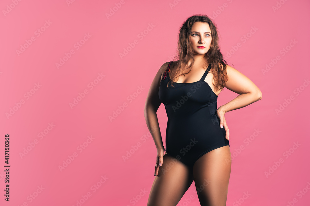 Sexy Plus Size Fashion Model In Black One Piece Swimsuit Fat Woman In Lingerie On Pink 114552