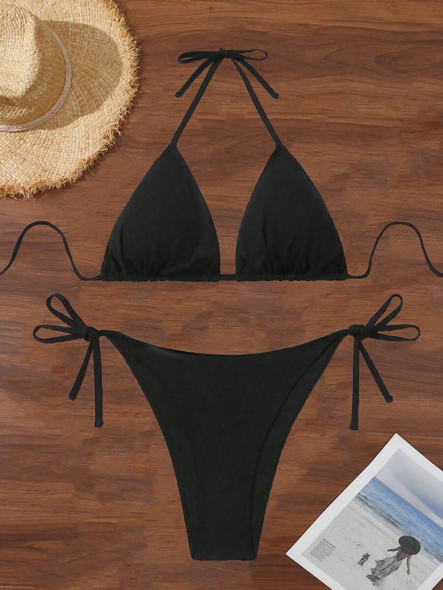 Tag : Shein Swim Curve Summer Beach Plus Size Solid Color Triangle Cup Bikini Set With Tie Knot Detail