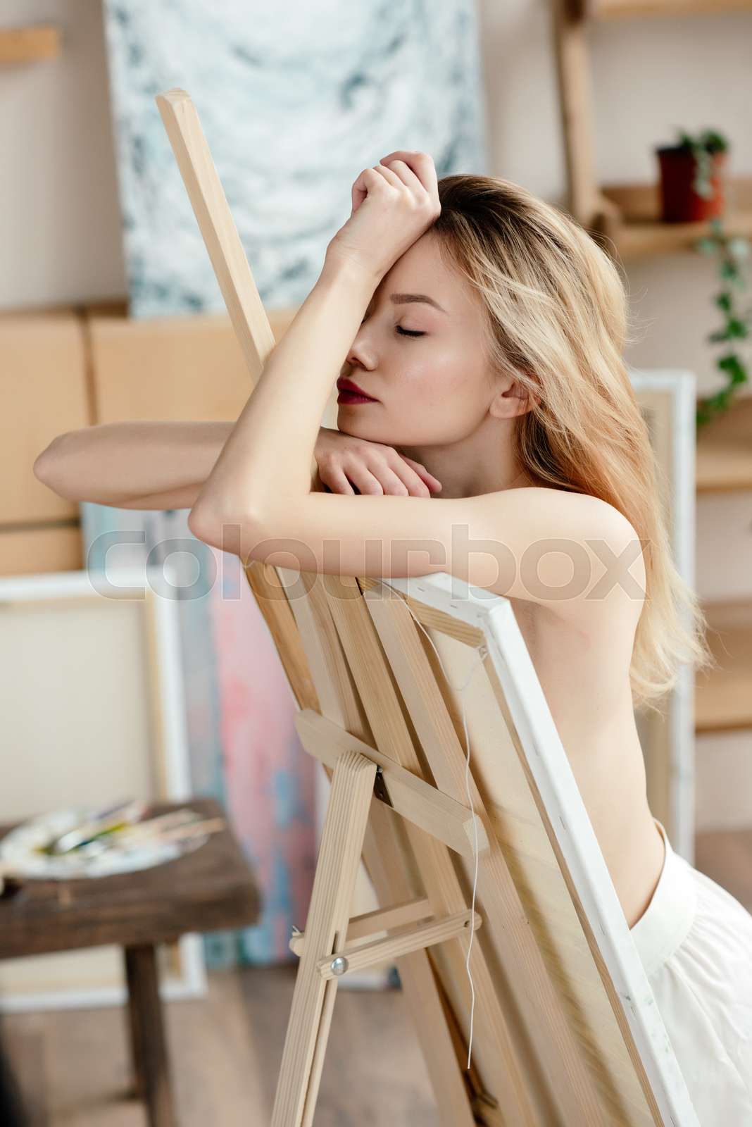 Side View Of Sensual Naked Artist With Closed Eyes Leaning At Picture On Easel Stock Image is a popular picture for sexy and hot.