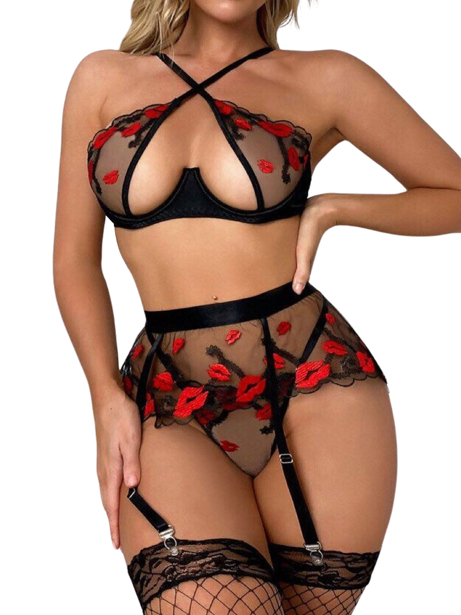 Sladyglo Women Front Cross Over Floral Pattern Lace Bralette And Panty Seductive Lingerie Set is a popular picture for sexy and hot.