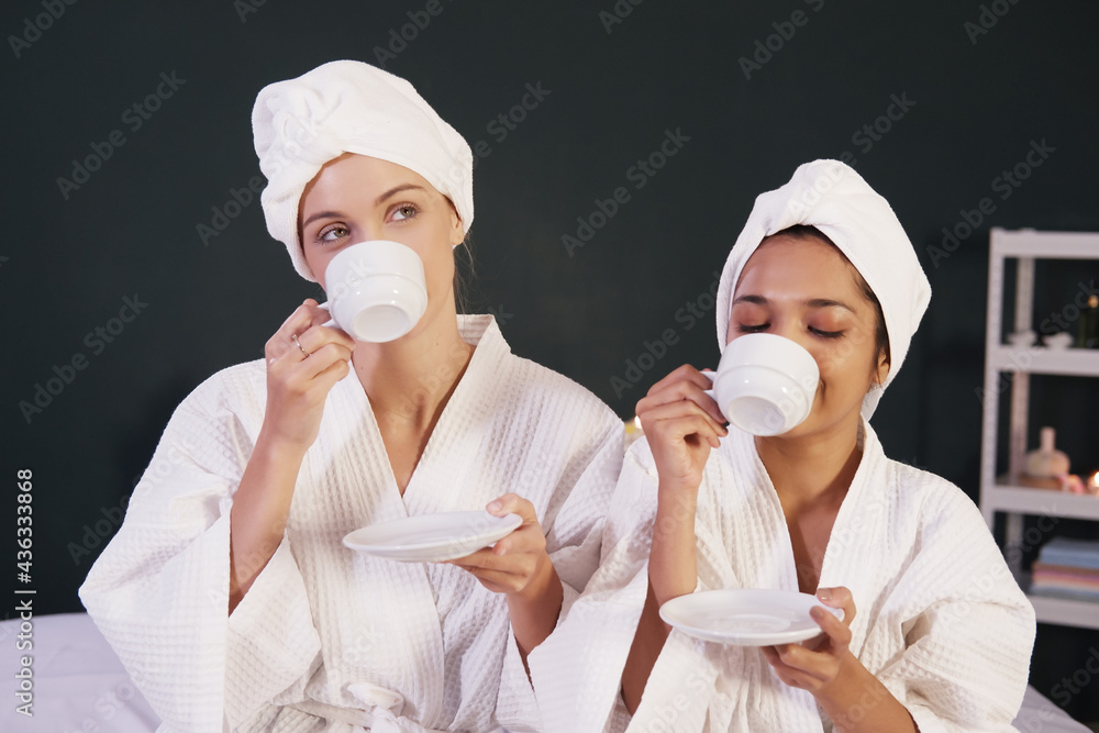 Tag : Smiling Caucasian And Asian Woman In White Bathrobe And Headscarf Is Drinking Hot Of Coffee Or
