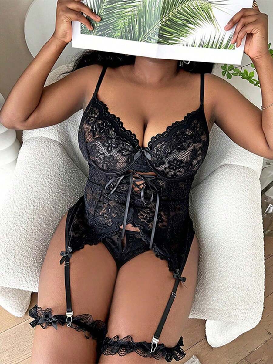 Tag : Sofusen Plus Size Piece Black Lace Lingerie Set For Women Sheer Bustier Corset Top With