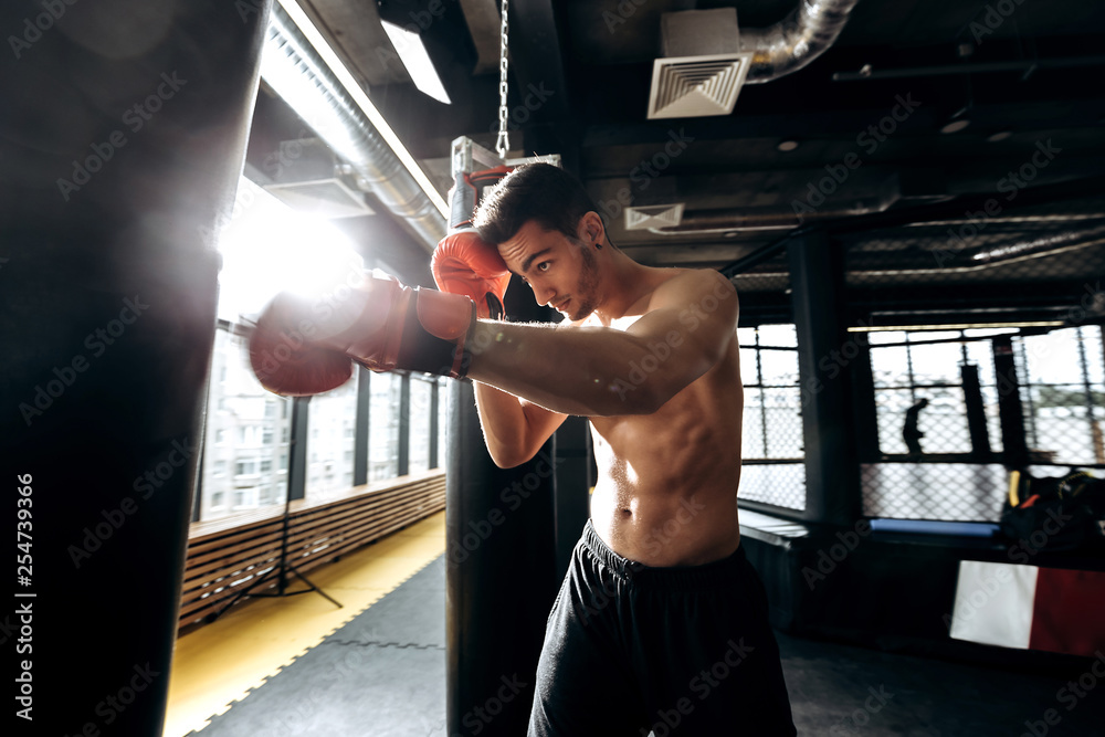 Tag : Sportsman In Red Boxing Gloves With A Naked Torso Dressed In The Black Shorts Hits Punching Bag
