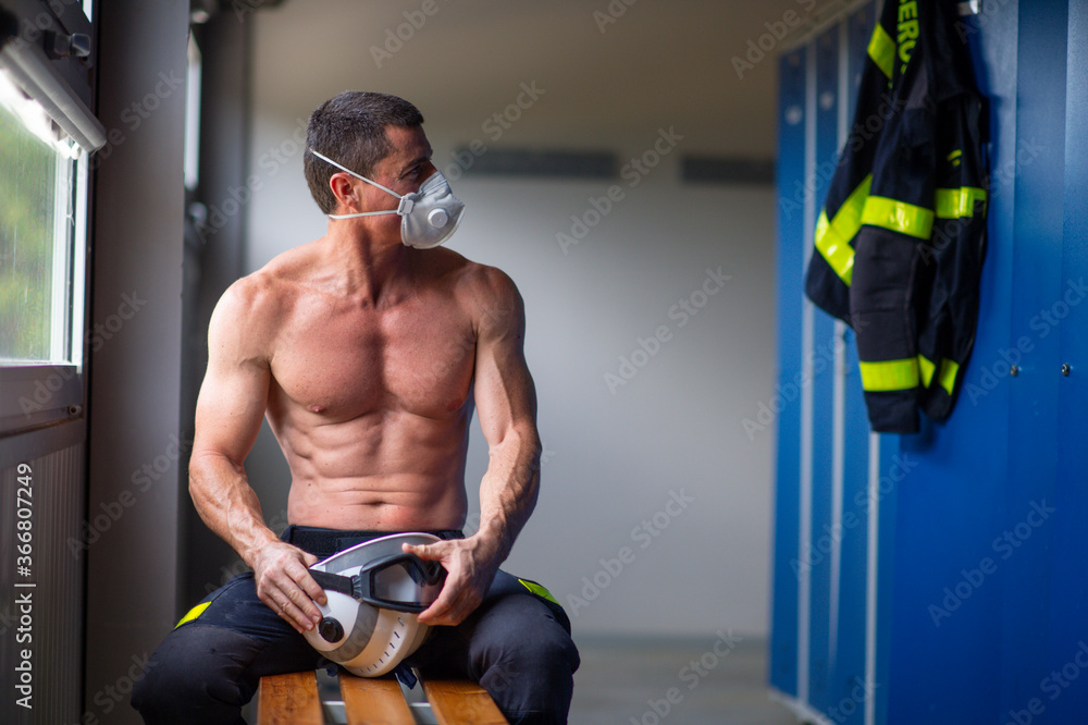 Tag : Strong Mature Male Firefighter With Naked Torso Sitting On Bench In Mask And Holding A Helmet