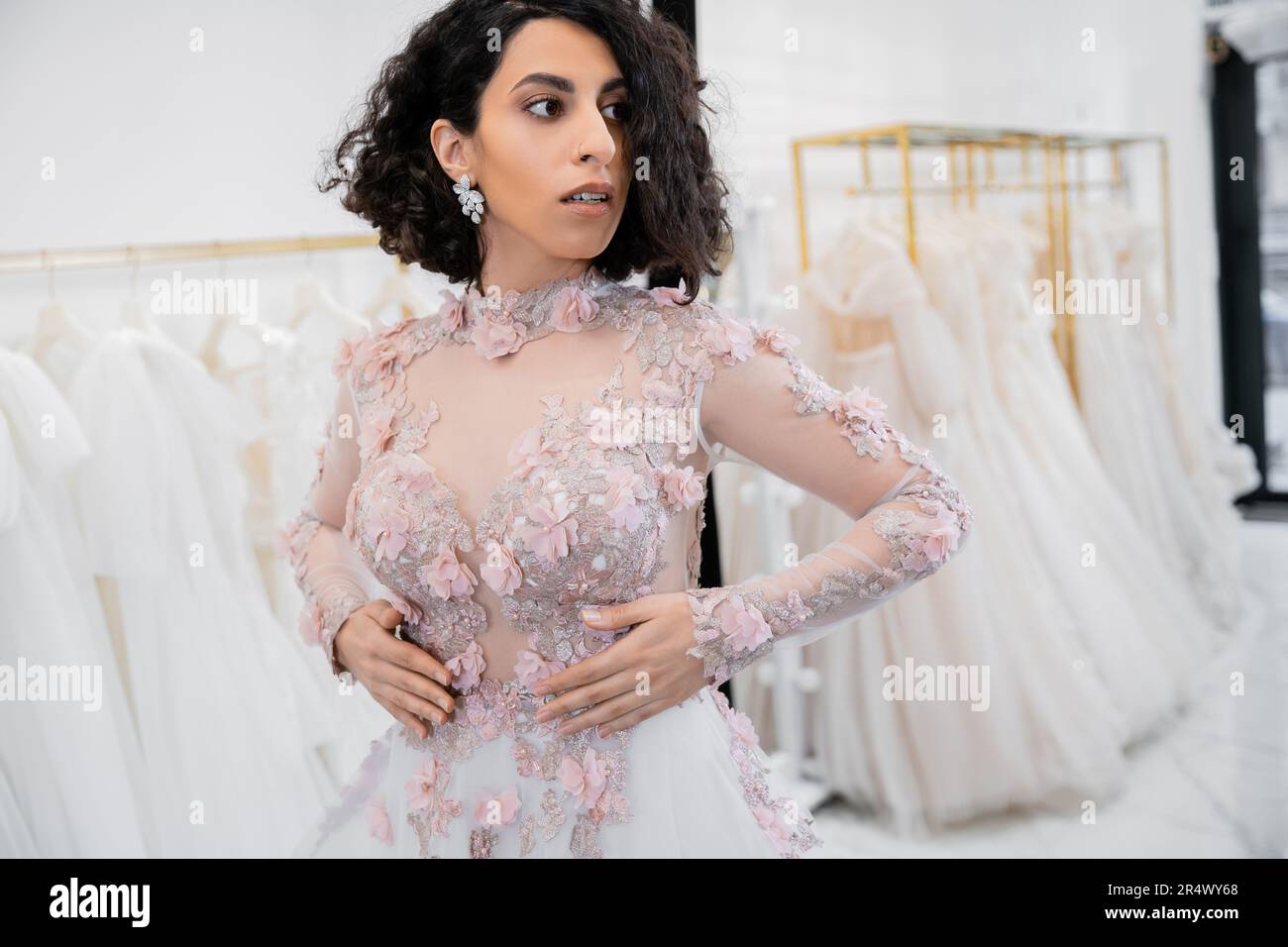 Stunning Middle Eastern And Brunette Bride With Wavy Hair Standing In Gorgeous And Floral Attire is a popular picture for sexy and hot.