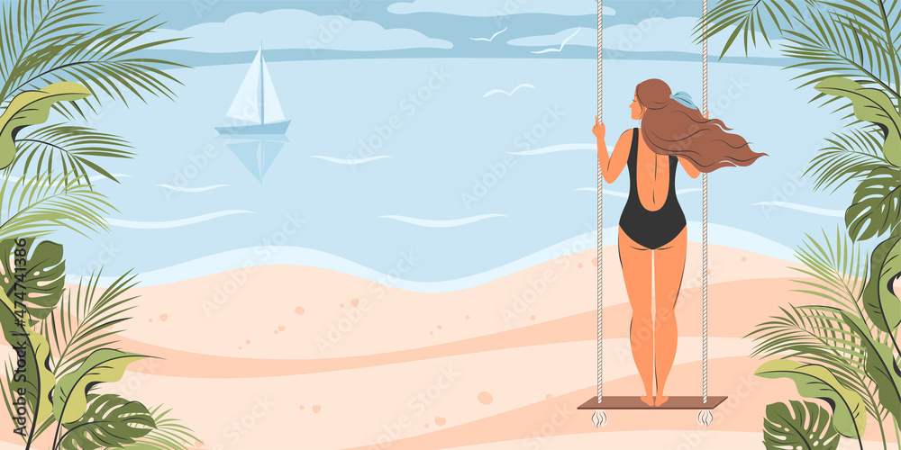 Tag : Summer Banner With Bikini Girl On The Beach On The Swing And With Tropical Leaves Vector
