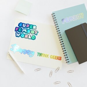 Tag : Super Gay Femboy Twink Geek Sticker Sheets Holographic Stickers Transparent White