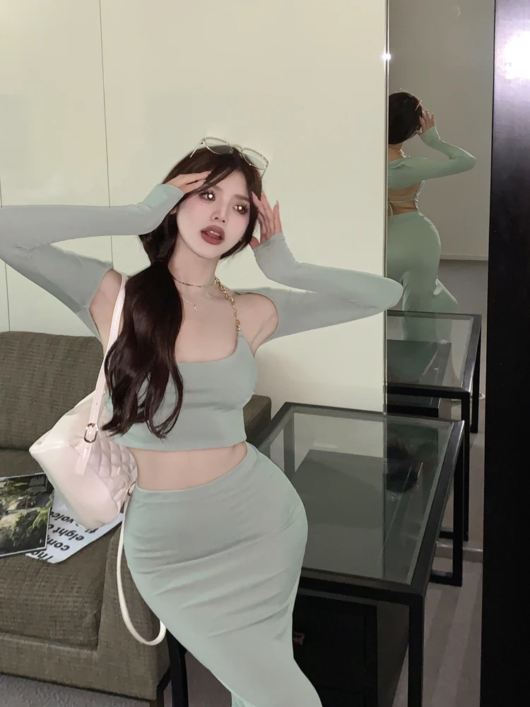 Sweet Hot Girl Suit Women S Spring Long Sleeved Shawl Chain Strap Top Hip Wrapped Skirt is a popular picture for sexy and hot.