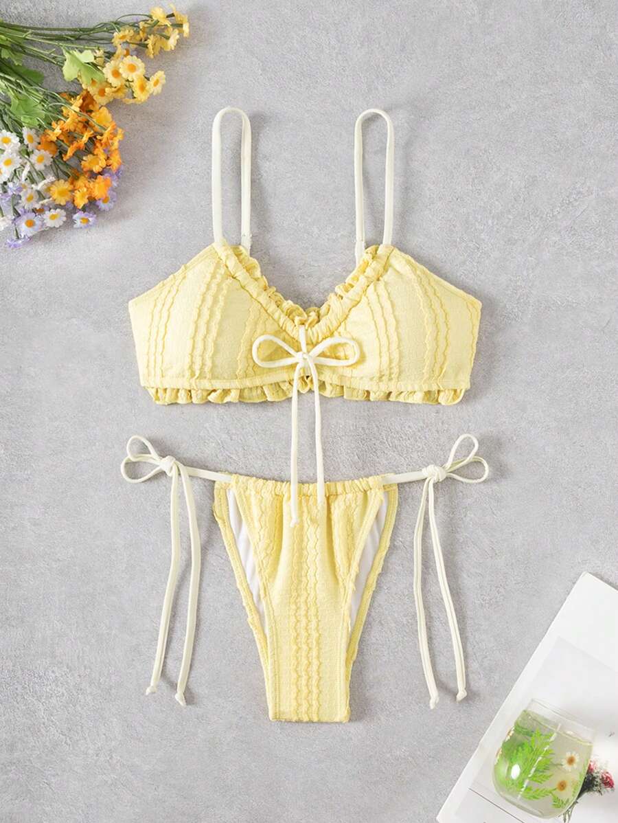 Sweetra Women S Romantic Vacation Cute Ruched Bright Yellow Rib Fabric Bikini Swimwear Set For is a popular picture for sexy and hot.