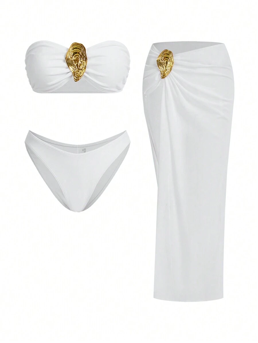 Tag : Swim Oasis Metal Decor White Bandeau Bikini Top And Bottom Bikini Set High Waist Cover Up