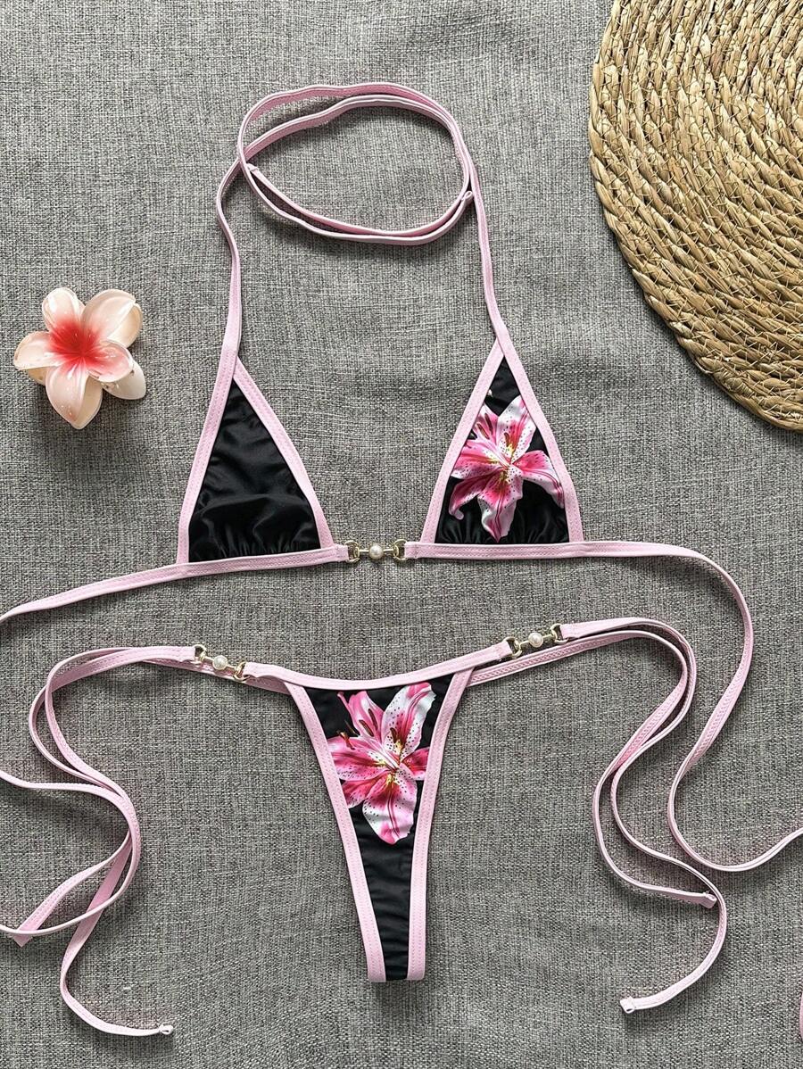Swim Vcay Pcs Floral Print Spaghetti Strap Backless Micro Bikini Top And Thong Bottoms Sexy is a popular picture for sexy and hot.