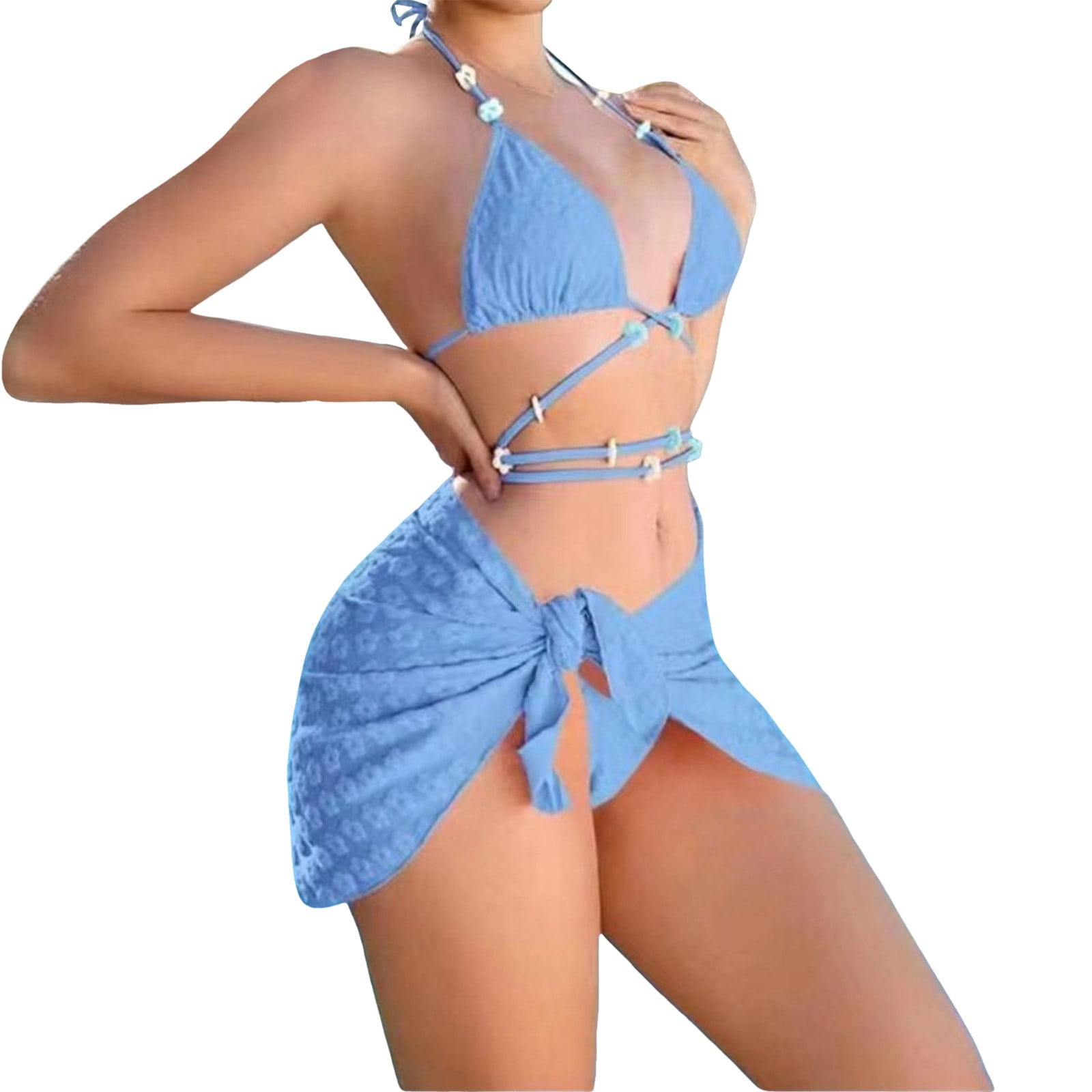 Swimsuits For Women Sexy Halter Neck Three Point Bikini Set With Cover Up Three Piece Blue is a popular picture for sexy and hot.