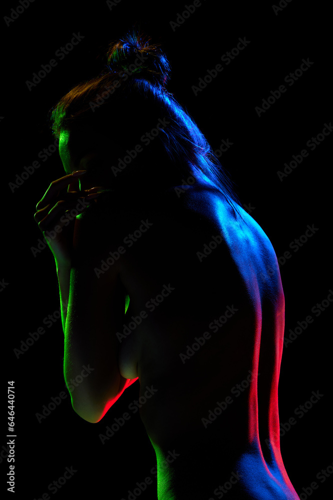 Tender Sensual Naked Woman Posing Against Black Studio Background In Neon Lights Self Care And is a popular picture for sexy and hot.