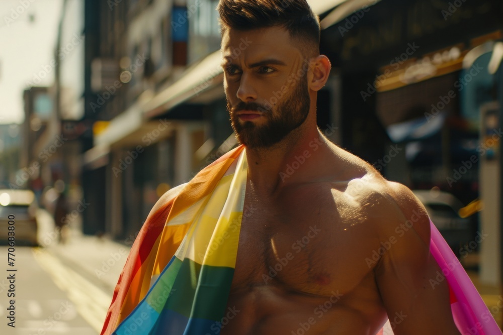 The Gay Man Walked Proudly Holding The Rainbow Pride Flag Aloft For All To See Stock Photo is a popular picture for sexy and hot.