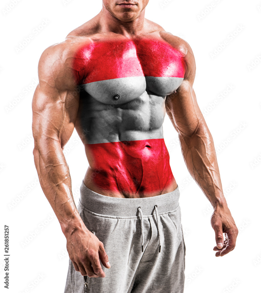 Tag : Torso Of Shirtless Muscular Man With Austria Flag Painted On Naked Chest Isolated On White In