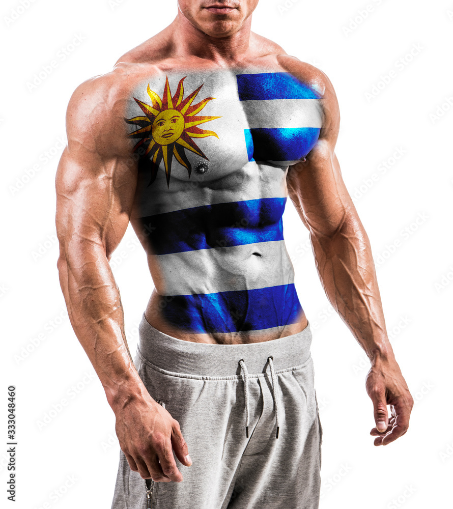 Tag : Torso Of Shirtless Muscular Man With Uruguay Flag Painted On Naked Chest Isolated On White In