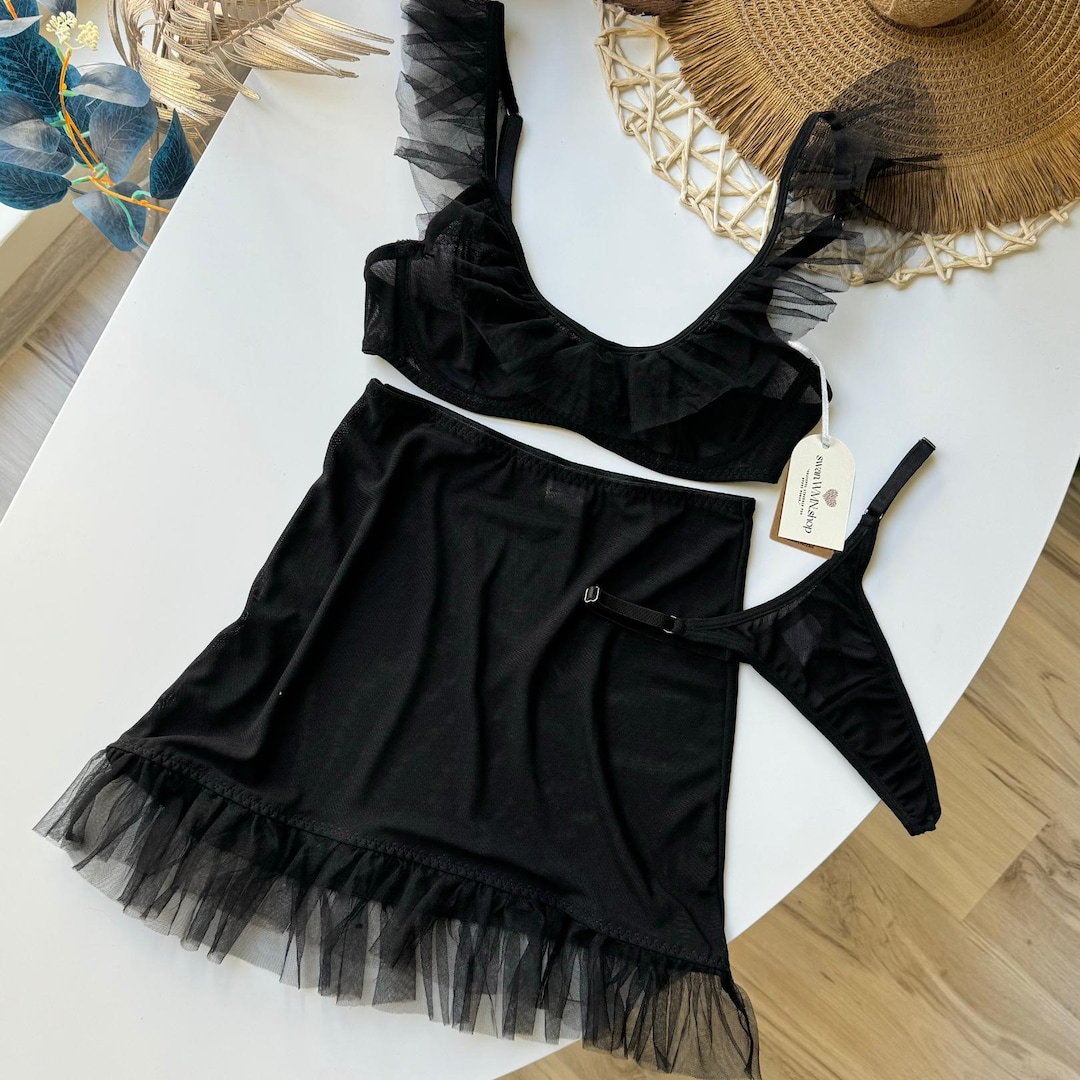 Tag : Transparent Black Lingerie Sheer Skirt With Matching Bra And Thong Set Thong And Skirt