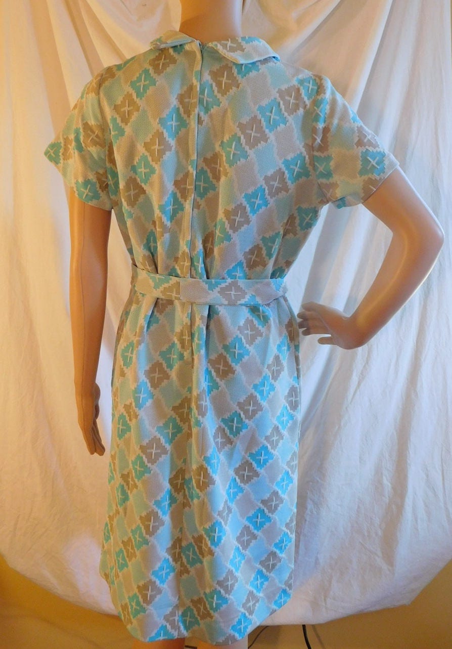 Turquoise Brown Pussy Bow Collar Day Dress Vintage S S Short Sleeve Day Dress Sheath Dress