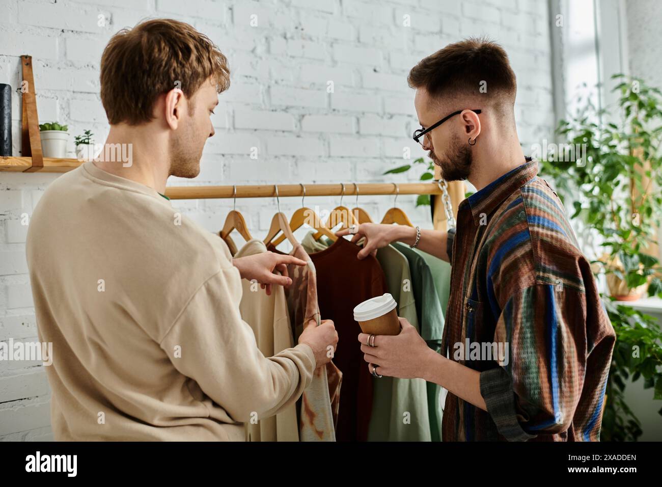 Tag : Two Men A Gay Couple Stand Side By Side In A Designer Workshop Collaborating On Trendy Attire