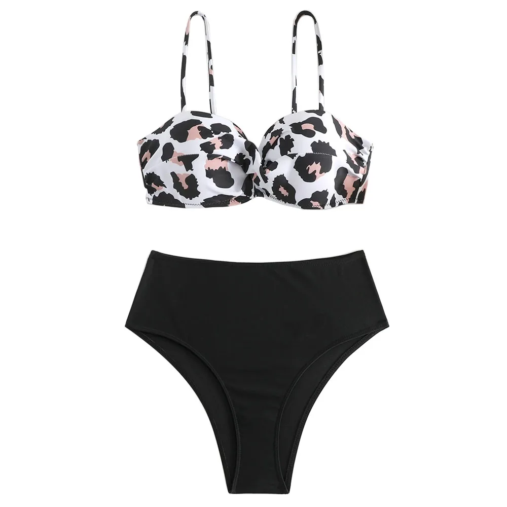 Two Pieces Bikini Set Leopard Print Swimsuits Twist Front Top High Waist Panty Swimwear Women is a popular picture for sexy and hot.
