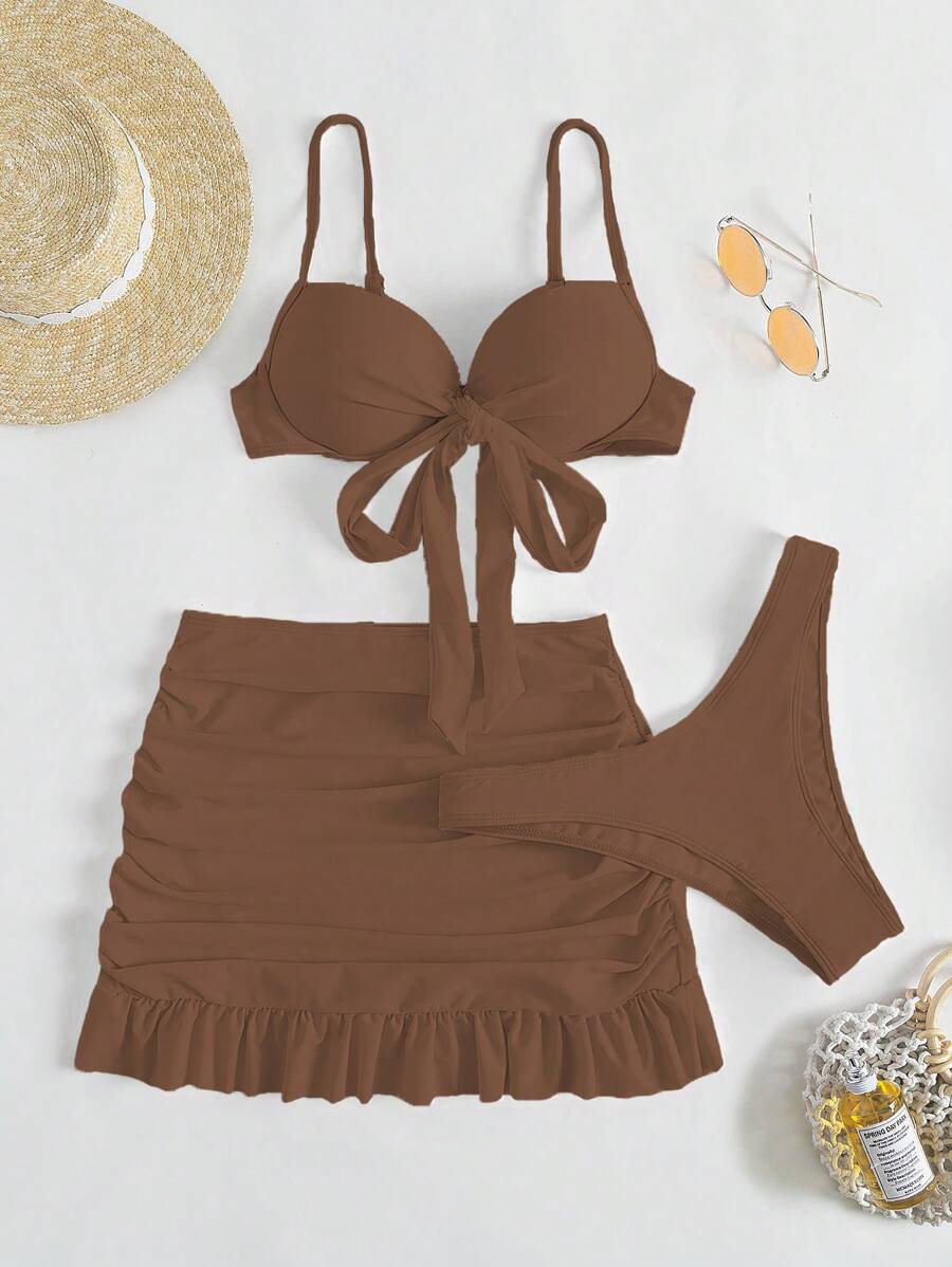 Tag : Unicolor Set De Bikini Con Nudo Delantero Sujetador Push Up Corte Alto Bottom Fruncido Falda