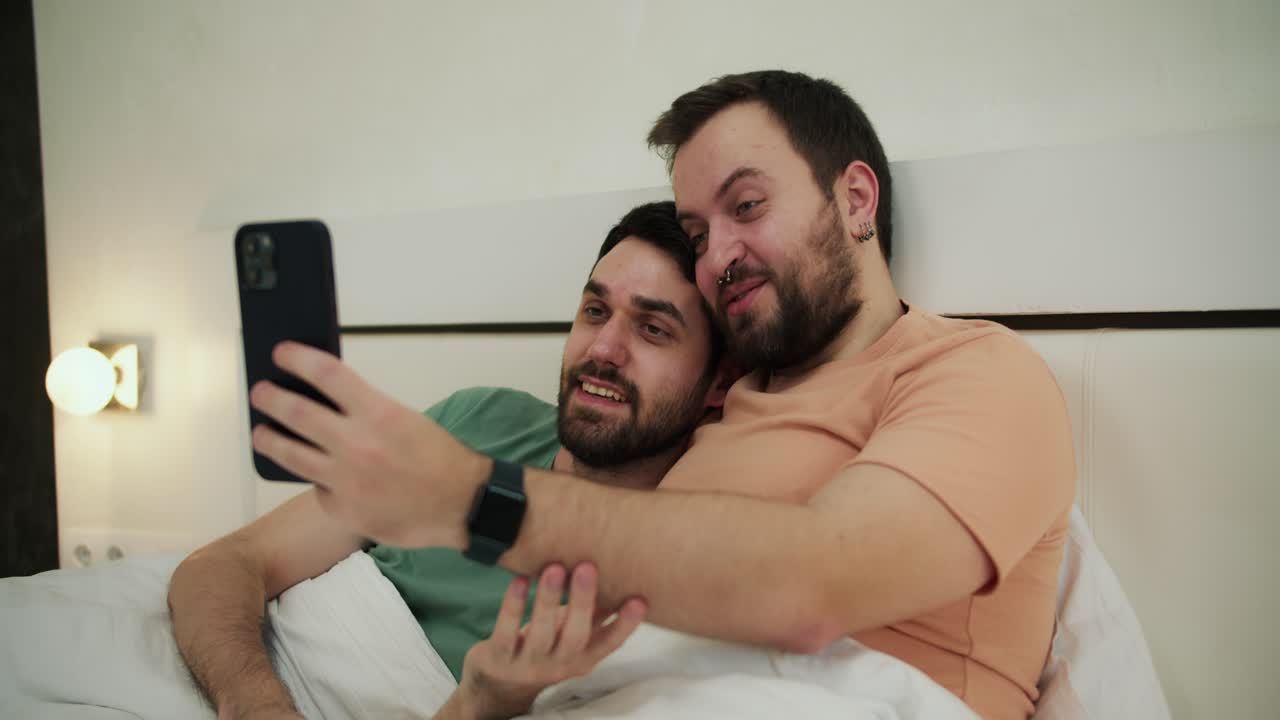 V Deo Premium Pareja Gay Son Selfie Tomar Una Foto En La Cama Divirti Ndose Juntos En El is a popular picture for sexy and hot.
