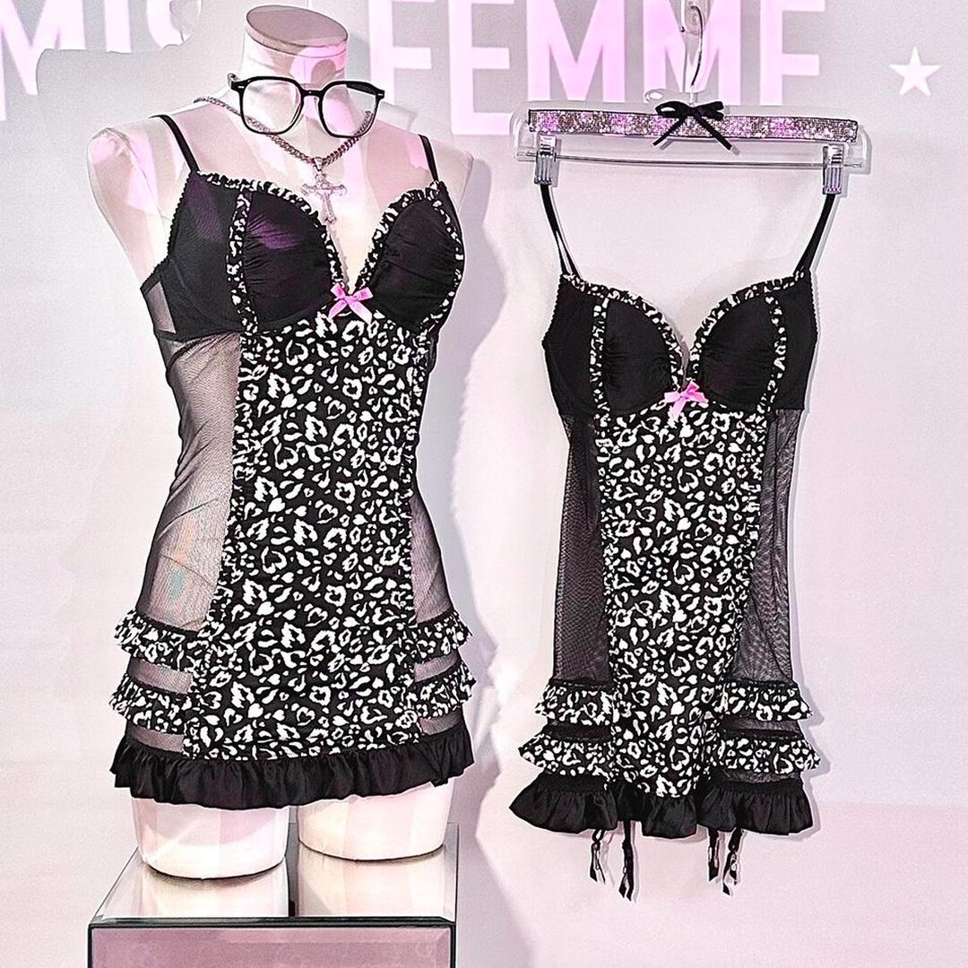 Victorias Secret Black White Leopard Print Sheer Lace Babydoll Ruffle Mini Lingerie Dress 152635