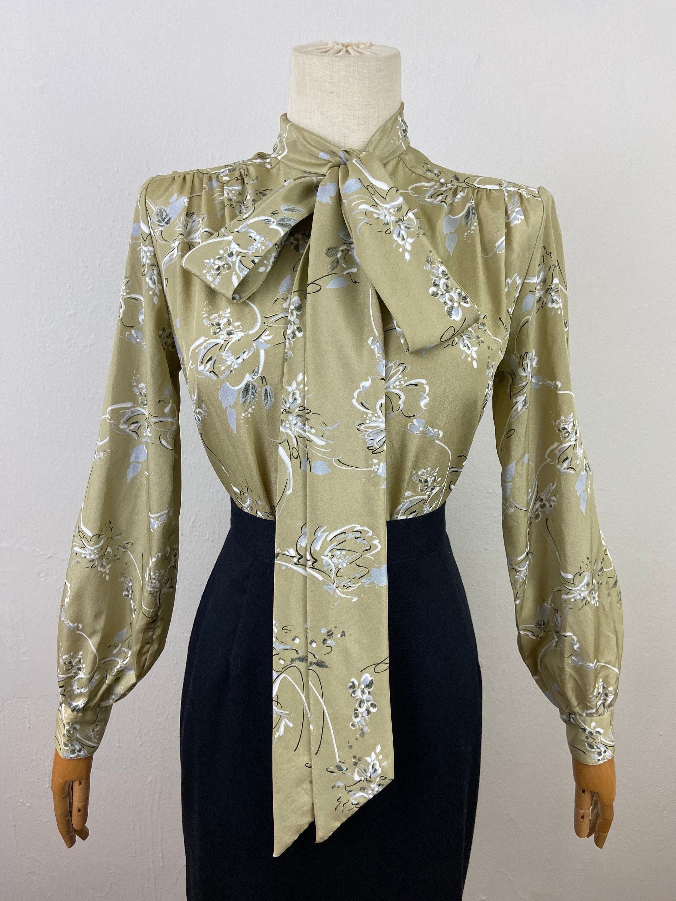 Vintage S Evan Picone Golden And Silver Abstract Floral Print With Pussy Bow Ribbon Collard 151970