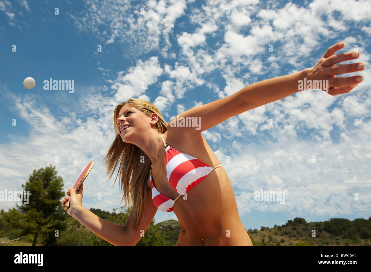 Woman In Bikini With Racket Poised Stock Photo Alamy is a popular picture for sexy and hot.