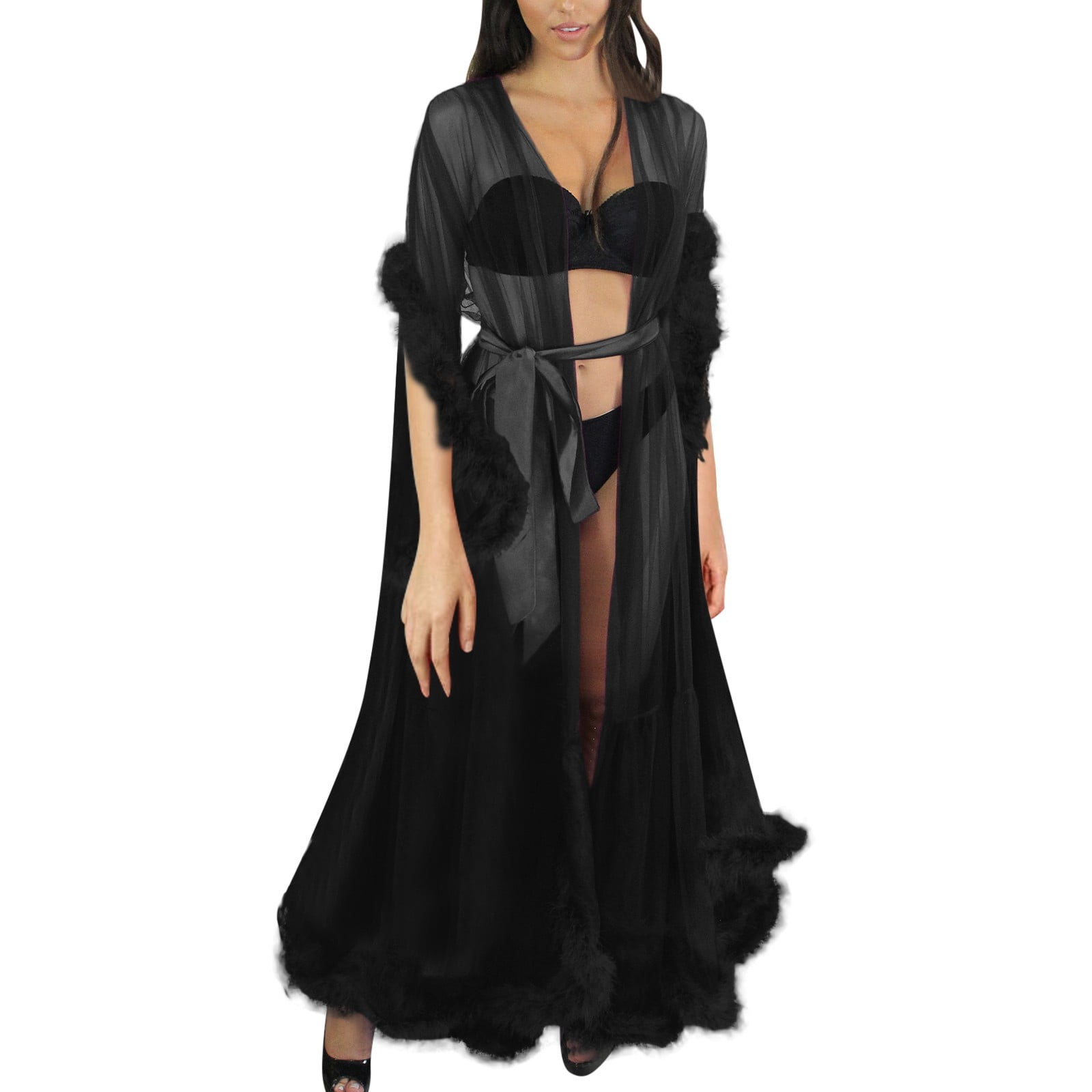 Women Fashion Tulle Robe Long Lingerie Nightgown Bathrobe Sleepwear Feather Bridal Robe Lace