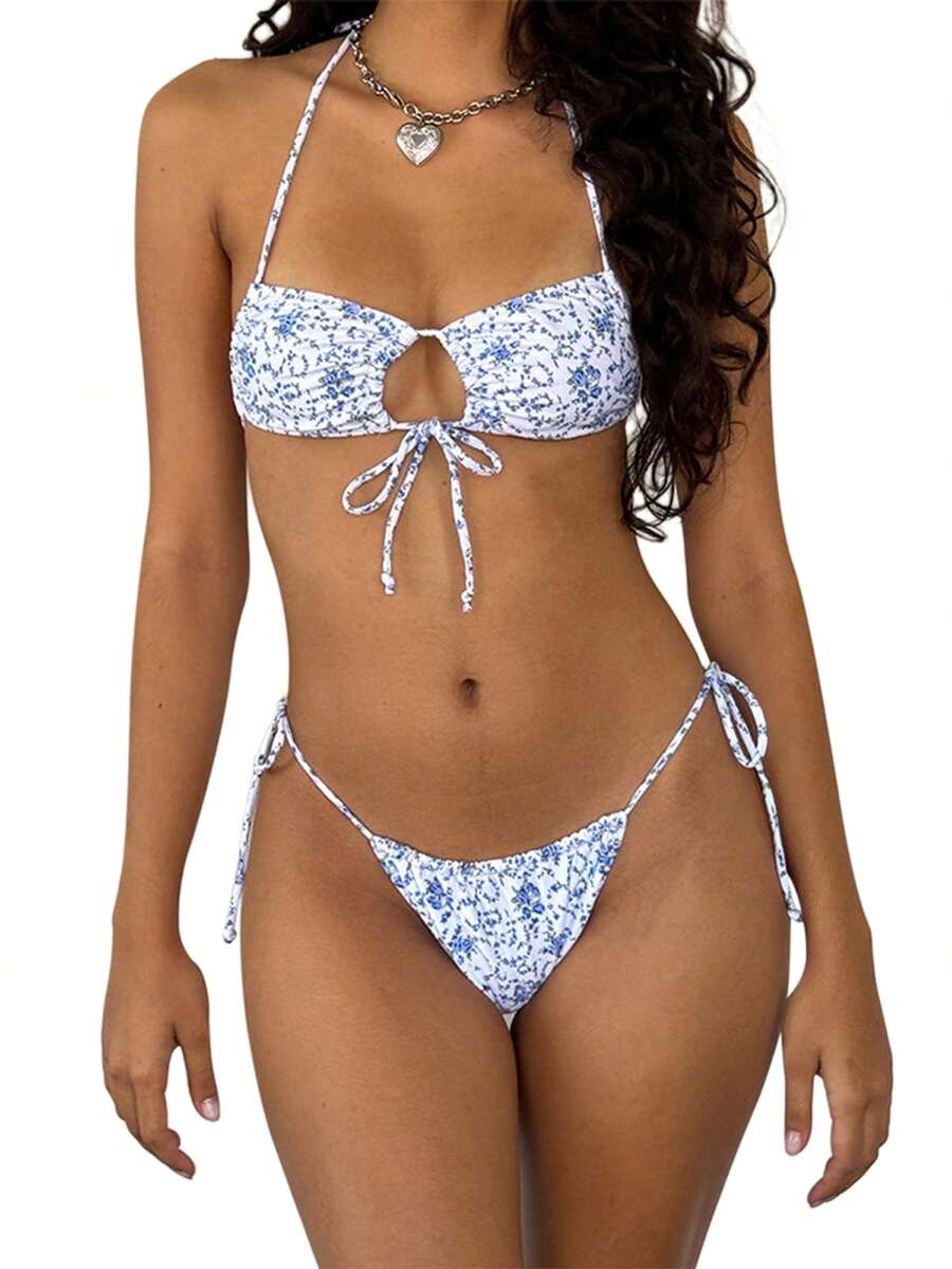 Women Pieces Bikini Swimsuits Floral Print Solid Color Tie Up Halter Neck Padded Bra Thong is a popular picture for sexy and hot.