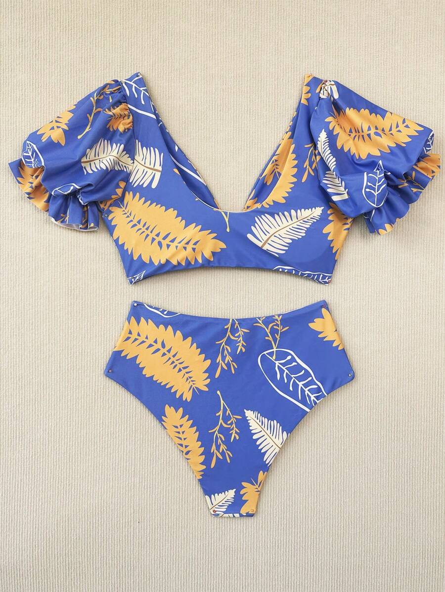 Women S Leaf Print Puff Sleeve Cropped Top And Bikini Bottoms Two Piece Swimsuit Set Carnival is a popular picture for sexy and hot.