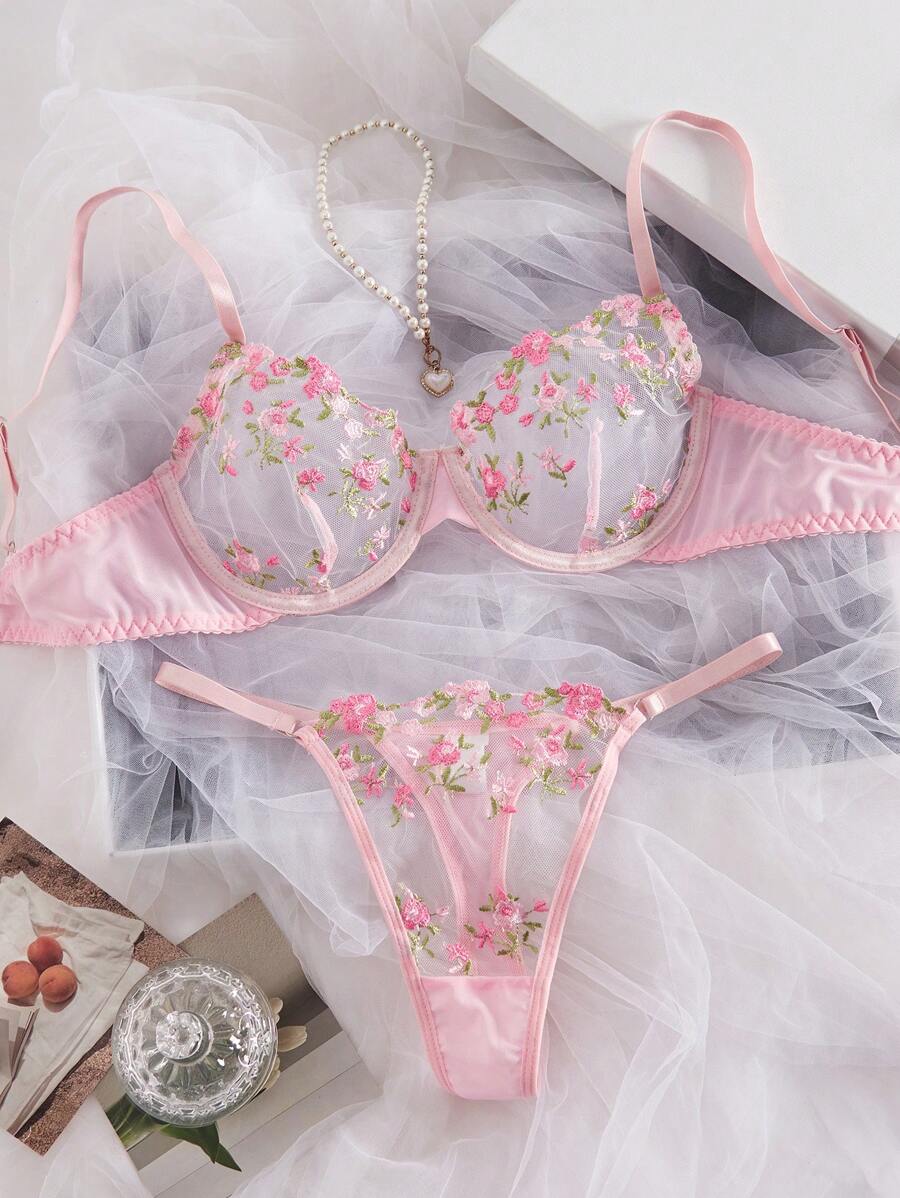 Tag : Women S Pink Floral Embroidered Mesh Camisole Bra And Thong Panty Lingerie Set Rave Shein Usa
