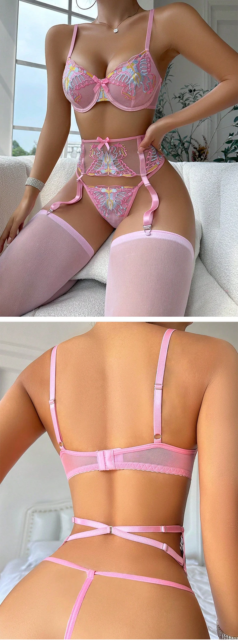 Related pictures for Women Sexy Butterfly Embroidered Bow Lingerie Set Femmes Pink Transparent Mesh Comfortable