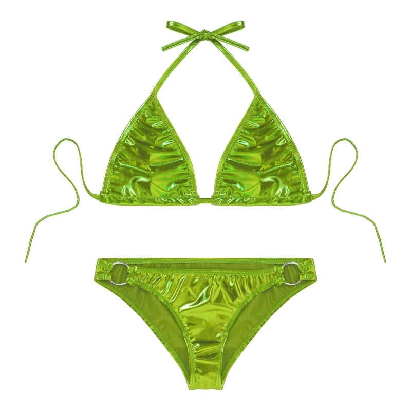 Womens Metallic Shiny Pool Party Bathing Suit Halter Lace Up Bra O Ring Briefs Bikini Swimwear