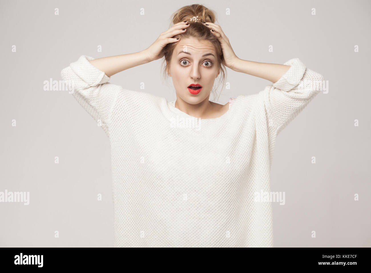 Tag : Wow Winner Blonde Open Mouth Touching Her Head Studio Shot Gray Background Stock Photo Alamy