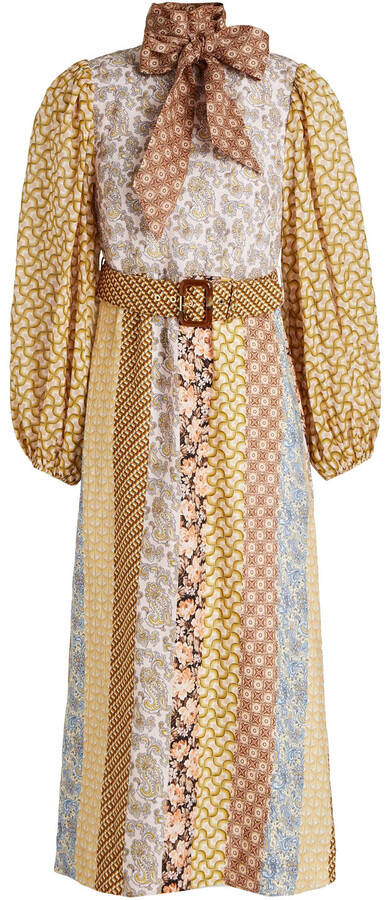 Tag : Zimmermann Pussy Bow Belted Patchwork Effect Linen Midi Dress Shopstyle